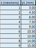 In the results of y1, a trend line is present to represent the lineal relationship between force and extension, however this trend line is not completely consistent across all data points. This indicates an error in either the experimental procedure or the assumptions made from analysis. Assuming Hooke’s Theory is true (which is a fair assumption) this data does not follow the conditions if the material is within the plastic region. This could suggest that the data is fairly accurate and is recorded passing over the plastic region limit.